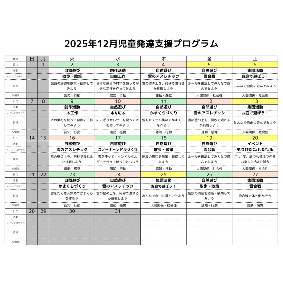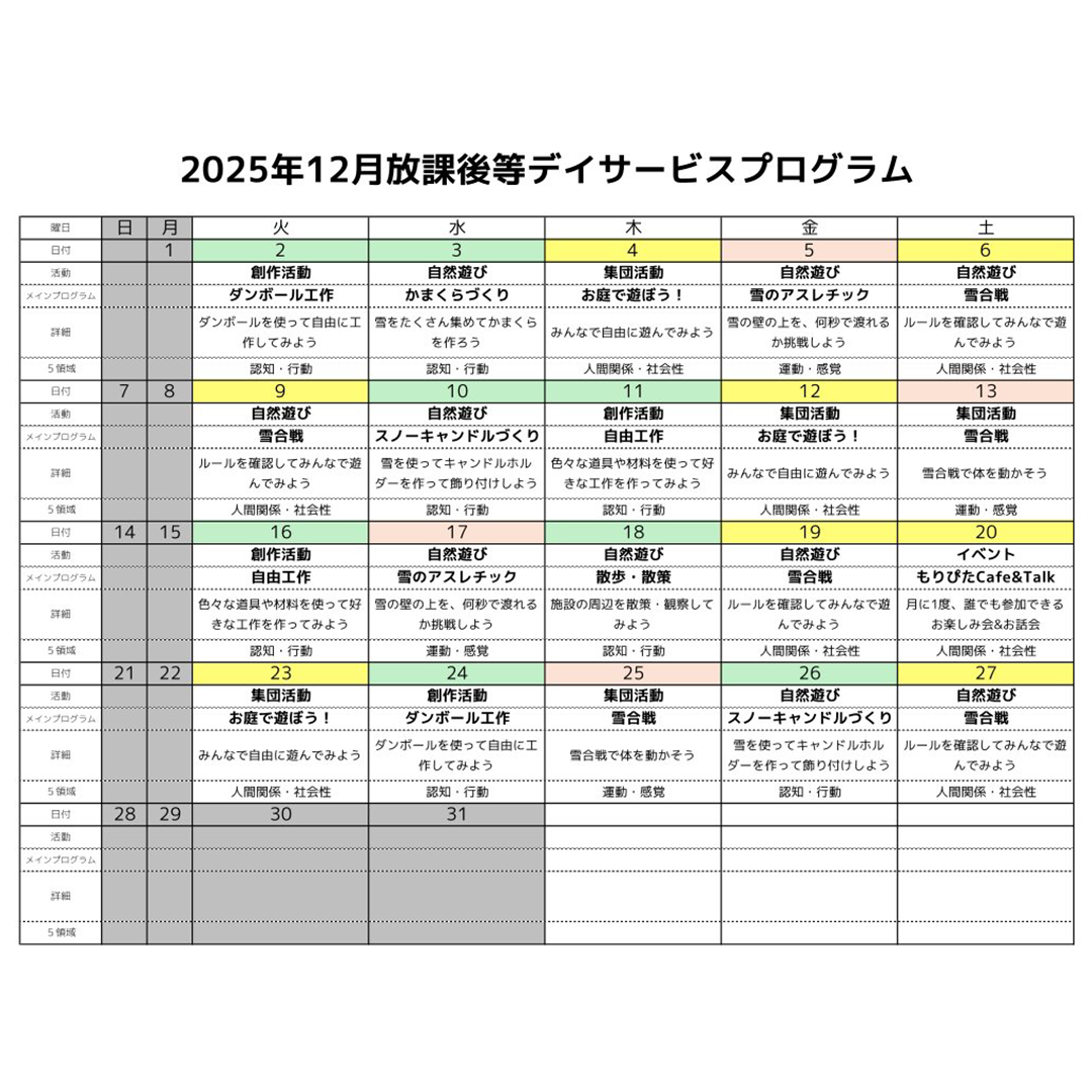 12月も、もりぴたの豊かな環境を活かした自然遊びや季節の制作など、楽しいプログラムをたくさん企画しています✨ カレンダーに記載されたメインプログラムだけでなく、子どもたちの「やりたい!」という気持ちを大切にした活動も日々行っています🌱